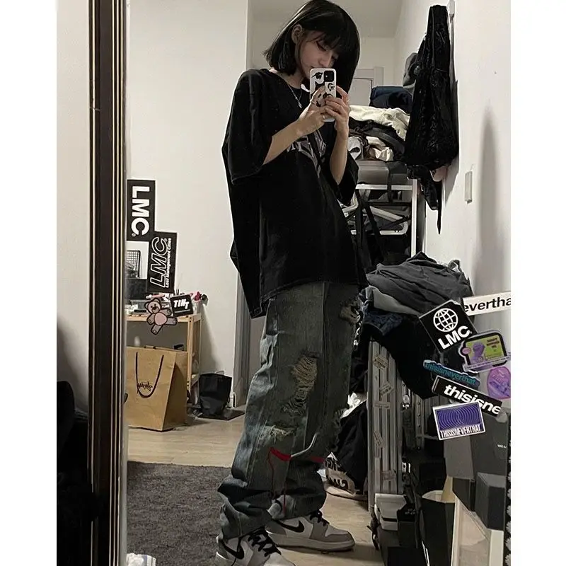 Hole trend girl denim straight leg pants women hiphop high street retro Y2K hot girl high waist loose wide leg pants jeans women